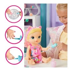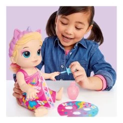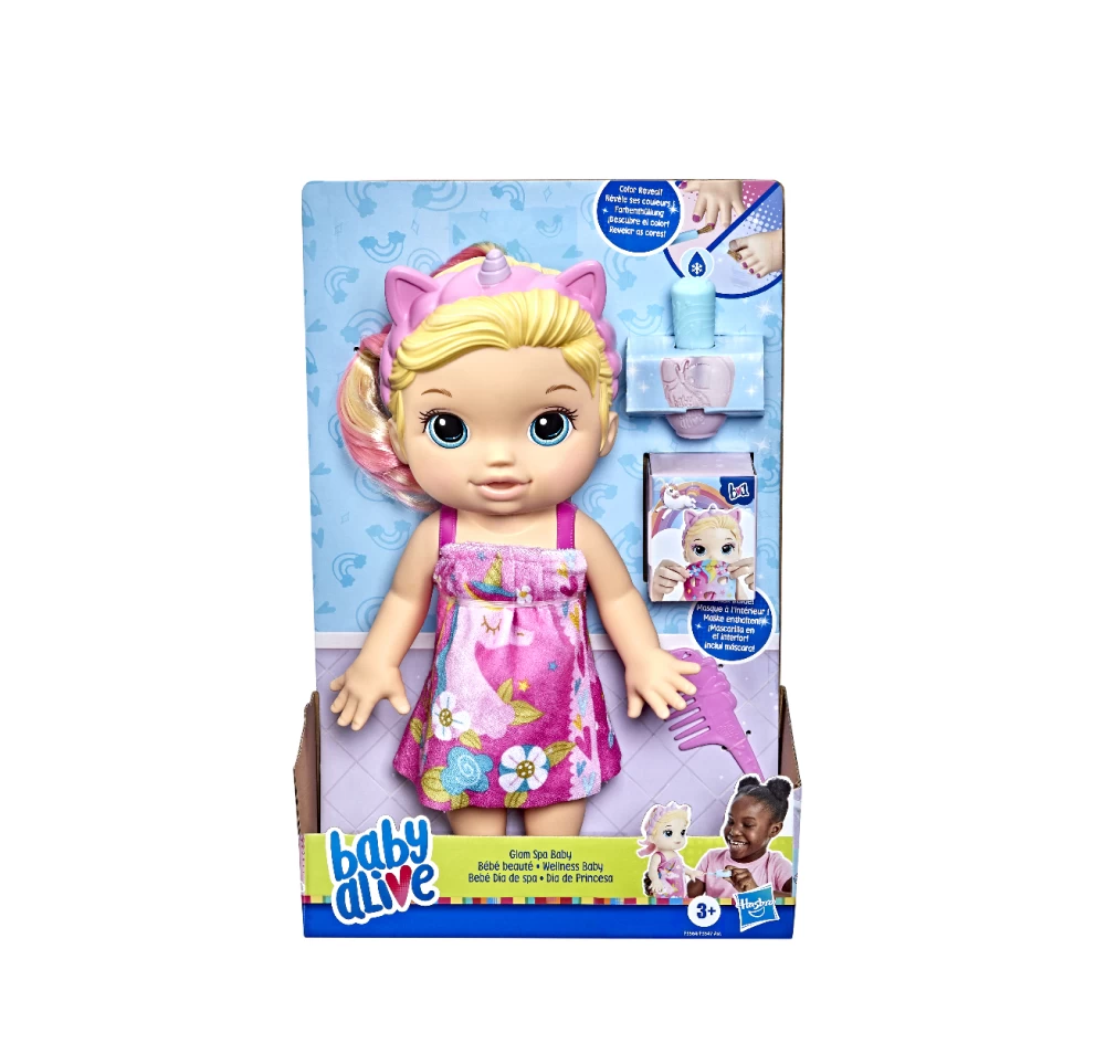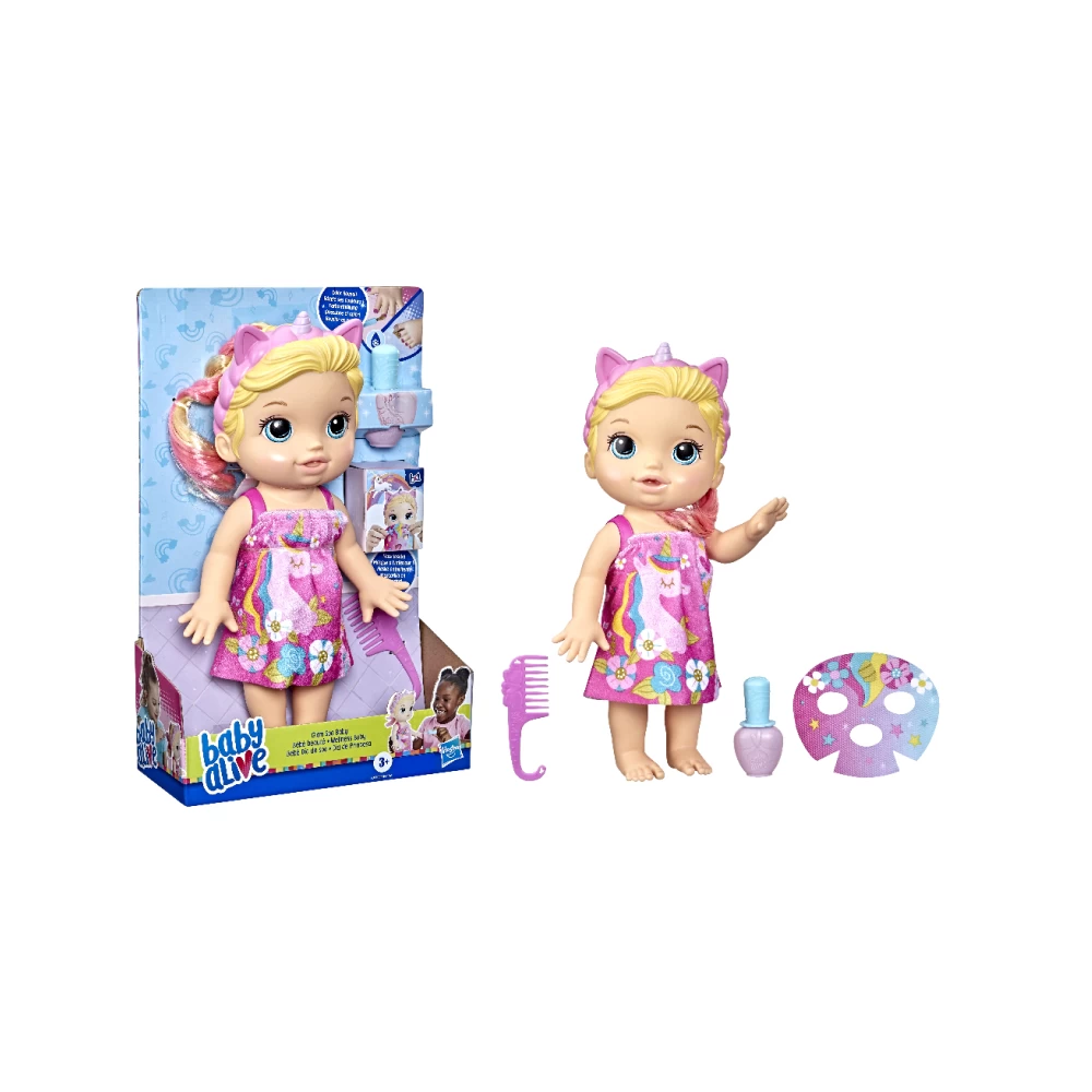 Pamper baby with spa day accessories to make her feel glamourous! With ice cold water, fill the pretend nail polish bottle and give Baby Alive Glam Spa Baby doll a color reveal mani-pedi. Then fill a bowl with ice cold water and soak doll’s mask — apply to her face and remove for a gorgeous eye makeup reveal! This adorable 12.8-inch waterplay doll comes wearing a pink molded swimsuit and attached themed headband. She also features unicorn-themed spa doll accessories, including a towel wrap, doll mask and pretend nail polish bottle. Plus, she even comes with a comb for kids to brush and style her pink color-streaked ponytail! Glam Spa Baby makes a fun makeup-themed doll for girls and boys ages 3 and up. This Baby Alive doll is also a fantastic toy for kids’ birthday and holiday gifts.