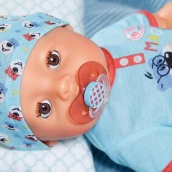 - REALISTIC DOLL β Skin is soft to the touch; ideal for cuddling; arms are flexible so itβs easy to dress and undress; makes playing easier and more fun; he can stand on his own; doll wears blue bodysuit with a hat and has brown eyes; ages 3+ years