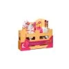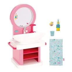 Dental hygiene is so much fun with the Toothcare Spa. Let’s start by turning the lights on. The frame of the mirror is illuminated. Tooth brushing expert Bruno the Bear has BABY born’s toothbrush ready to go and makes supportive brushing noises. After brushing her teeth, she uses her tooth mug that makes gargling noises. All that’s left to do is wipe off any splashes of toothpaste using her droplet-patterned towel and then she’s ready to play again. But being in the bathroom is actually pretty fun too. You can put the Berta the Duck plug in the sink, fill it with real water from the tap, and then quickly pull the plug to watch the water disappear again.