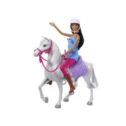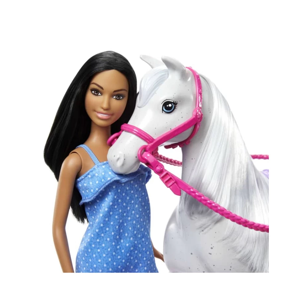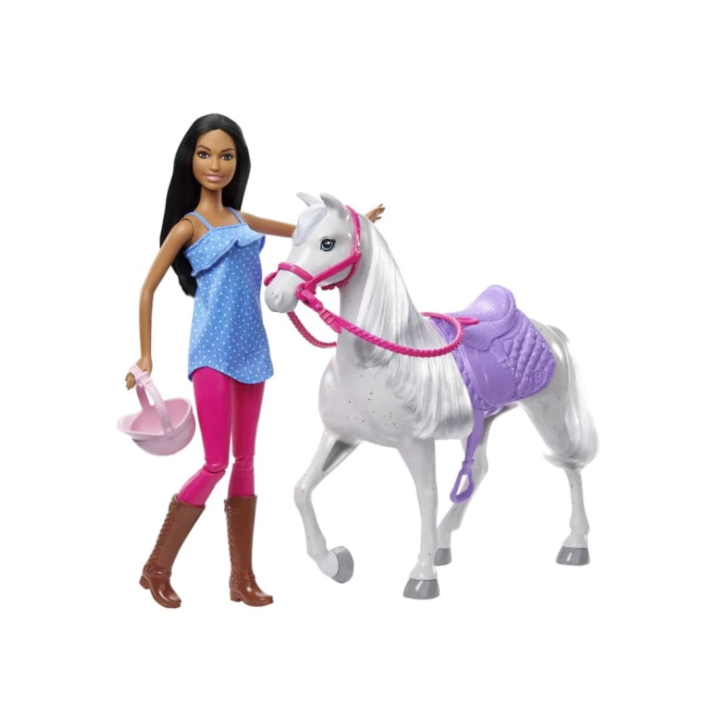 When Barbie rides her horse, she gallops into a fantasy world of adventure! She has a beautiful horse with saddle and bridle, so the two friends are well equipped to go on exciting journeys of discovery. Thanks to her movable knee joints, children can put her in the saddle. Just put on the helmet and the fun can start. Dressed in a casual outfit and riding boots, Barbie doll is ready for all-day playtime. Kids aged 3 and up will love going horseback riding with these two best friends because with Barbie, kids can be anything they imagine! The doll cannot stand by itself. Subject to deviations in color and design.