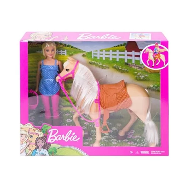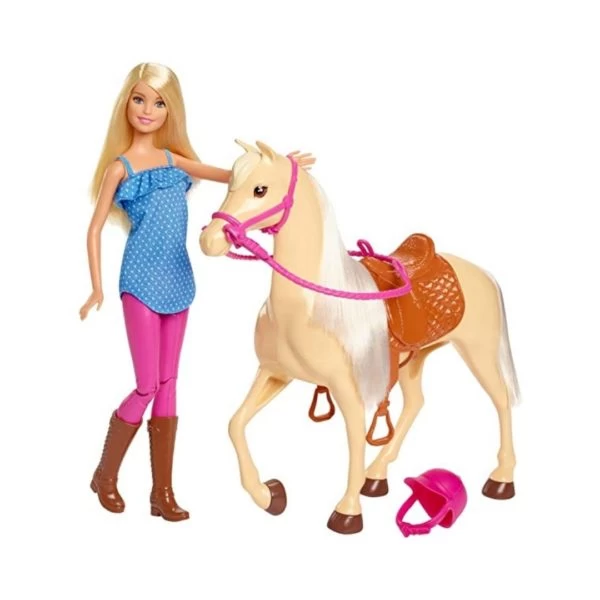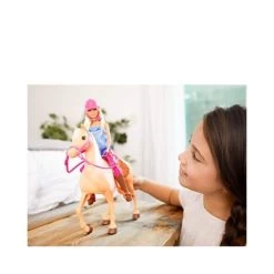 Barbie® doll is ready to help imaginations ride into playtime — on horseback! She comes with a gorgeous horse equipped with a saddle and bridle so these two besties can head out on adventures together. Just seat her on the horse to get a story started. Barbie® wears a casual riding outfit with boots and helmet and has knees that bend so she can sit on the horse. Kids will love riding off with these two friends and exploring the world because when a girl plays with Barbie® , she imagines everything she can become! Includes Barbie® doll wearing fashion and accessories, horse with removable bridle and saddle and helmet for doll. Doll cannot stand alone. Colors and decorations may vary.