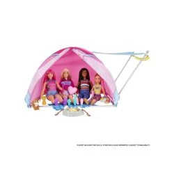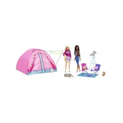 Head to the great outdoors with this Barbie It Takes Two™ playset featuring Barbie® ‘Malibu’ Roberts doll, Barbie® ‘Brooklyn’ Roberts doll, their very own tent and tons of themed accessories! Decorated with an awning and string lights, the extra-large, fabric camping tent features room for four dolls. Kids can set up camp, then play out starry night camping stories with folding chairs, a telescope, firepit, marshmallow roasters, a card game and more. Two woodland animals might even pop in to visit! With two dolls in cute camping looks and so many accessories, kids ages 3 years old and up can dream up endless outdoor adventures. Dolls cannot stand alone. Colors and decorations may vary.