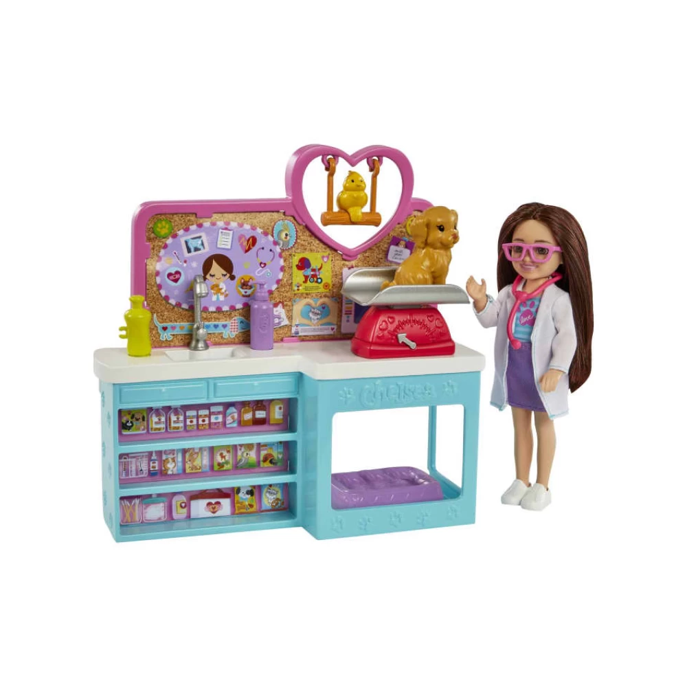- Explore taking care of animals and running a veterinarian office with the Barbie® Chelsea® Pet Vet playset.