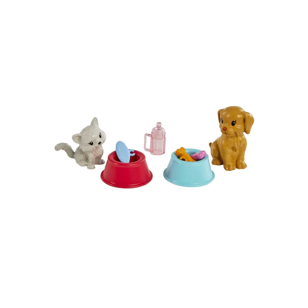- Additional play pieces include 18 items like a pet bed, cat tower, medical instruments, clipboard, a cone, pump bottle, medicine bottle, pet crate, feeding dishes, dog treats, band-aid sheet and more.