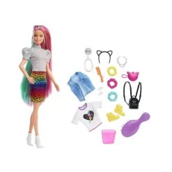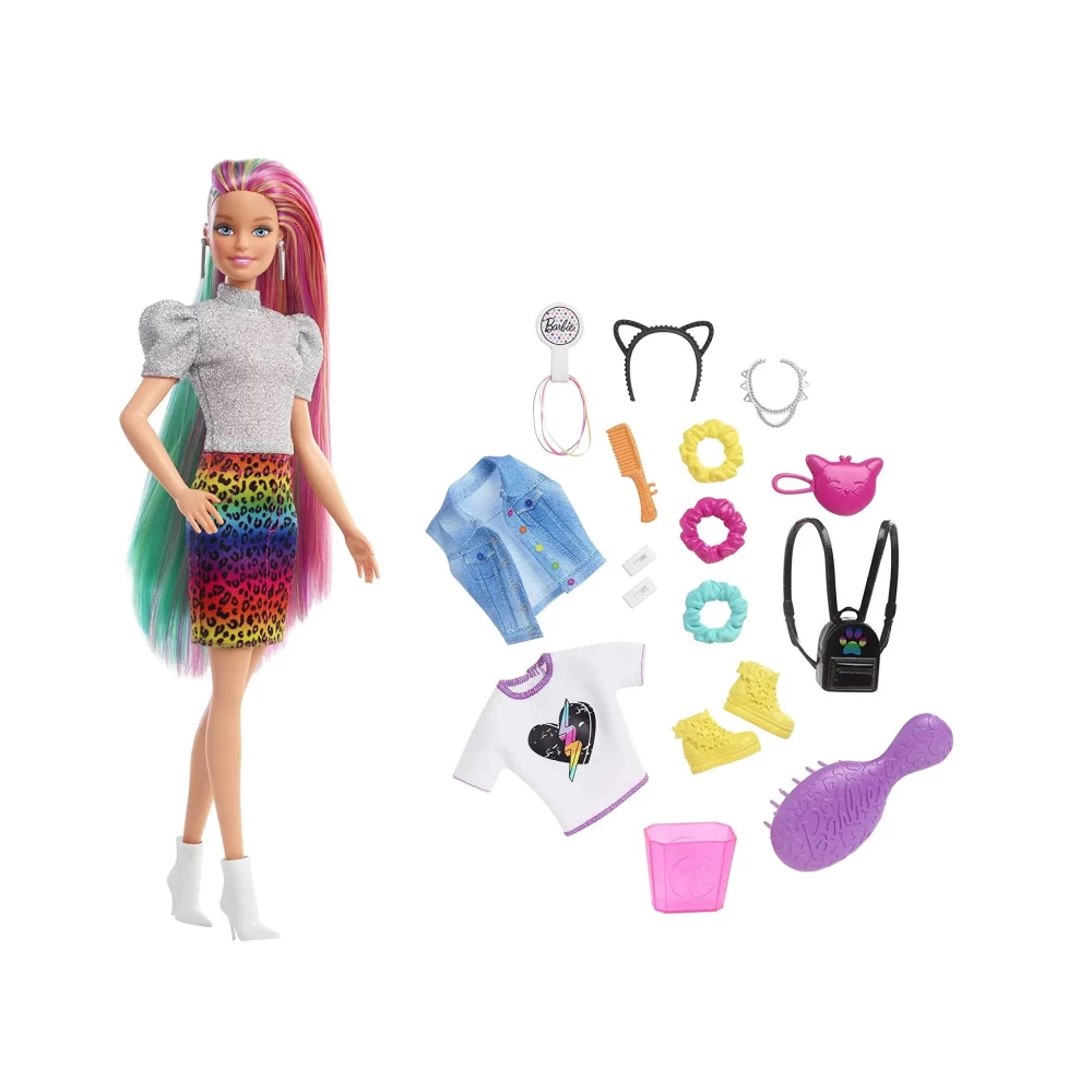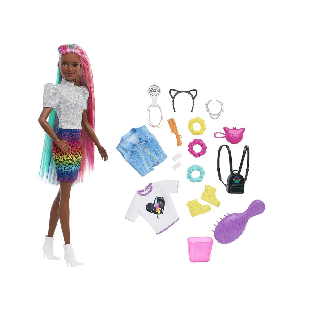 BarbieĀ® Leopard Rainbow Hair doll comes with these super-stylish items perfect for young stylists and fashion fun: 2 hair pins, 3 scrunchie bracelets (also work on BarbieĀ® dollās hair), hair bands, a brush, a heart T-shirt, jean vest, cat ears, a cat purse, necklace, backpack, an extra pair of shoes, a sponge wand for the color-change feature and a container for ice water.