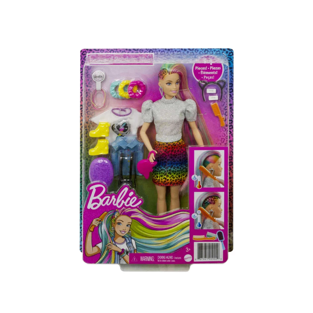 BarbieĀ® dollās style has no limits and she loves exploring different colors and styles to find the perfect look! With the BarbieĀ® Leopard Rainbow Hair doll, kids can go āwildā with her long rainbow-colored hair and brush it to the side to reveal a beautiful ombre rainbow look! For even more fun, they can activate the color-change feature on the side by adding cold water and watch a leopard print appear! So cool! BarbieĀ® doll also comes with 16 hair and fashion play pieces to create multiple mix and match outfit combinations and all kinds of hairstylesincluding using scrunchies that work on BarbieĀ® dollās hair. BarbieĀ® Leopard Rainbow Hair doll comes with these stylish items for fashion and hairstyling fun: 2 hair pins, 3 scrunchie bracelets (also work on BarbieĀ® dollās hair), hair bands, a brush, a heart T-shirt, jean vest, cat ears, a cat purse, necklace, backpack, an extra pair of shoes, a sponge wand for the color-change feature and a container for ice water. Kids will love the endless creative play and styling possibilities! Doll cannot stand alone. Colors and decorations vary. Makes a great gift for kids 3 to 7 years old.