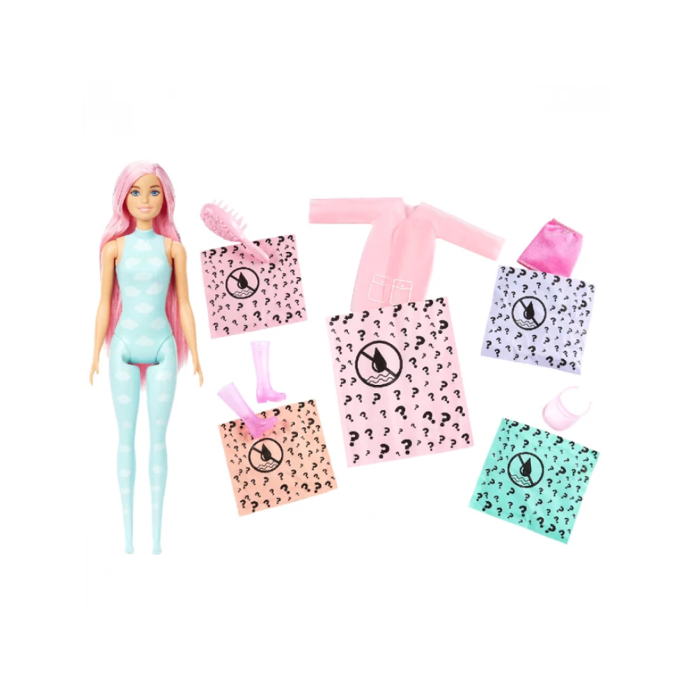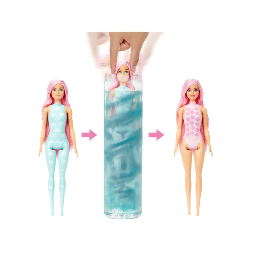 - ​Start the reveal experience by removing the outer layer of packaging, opening the tube and pulling out a Barbie doll whose look is covered in a colour Reveal cloud print and 4 decorated bags with hidden contents!