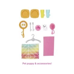 Includes Barbie® house, 1 comforter, 1 towel, 1 table, 2 dining chairs, 2 plates, 2 cups, 2 forks, 1 soap bottle, 1 hanger, 1 frying pan and 1 puppy figure.