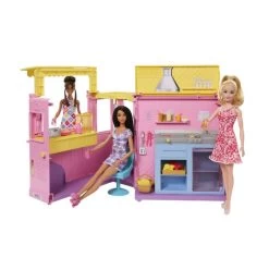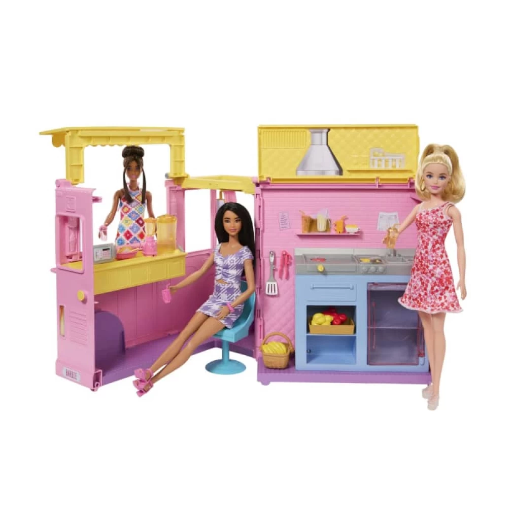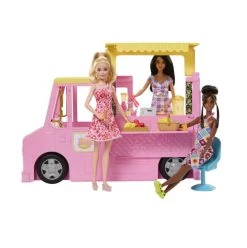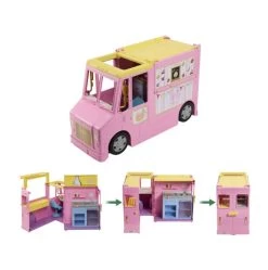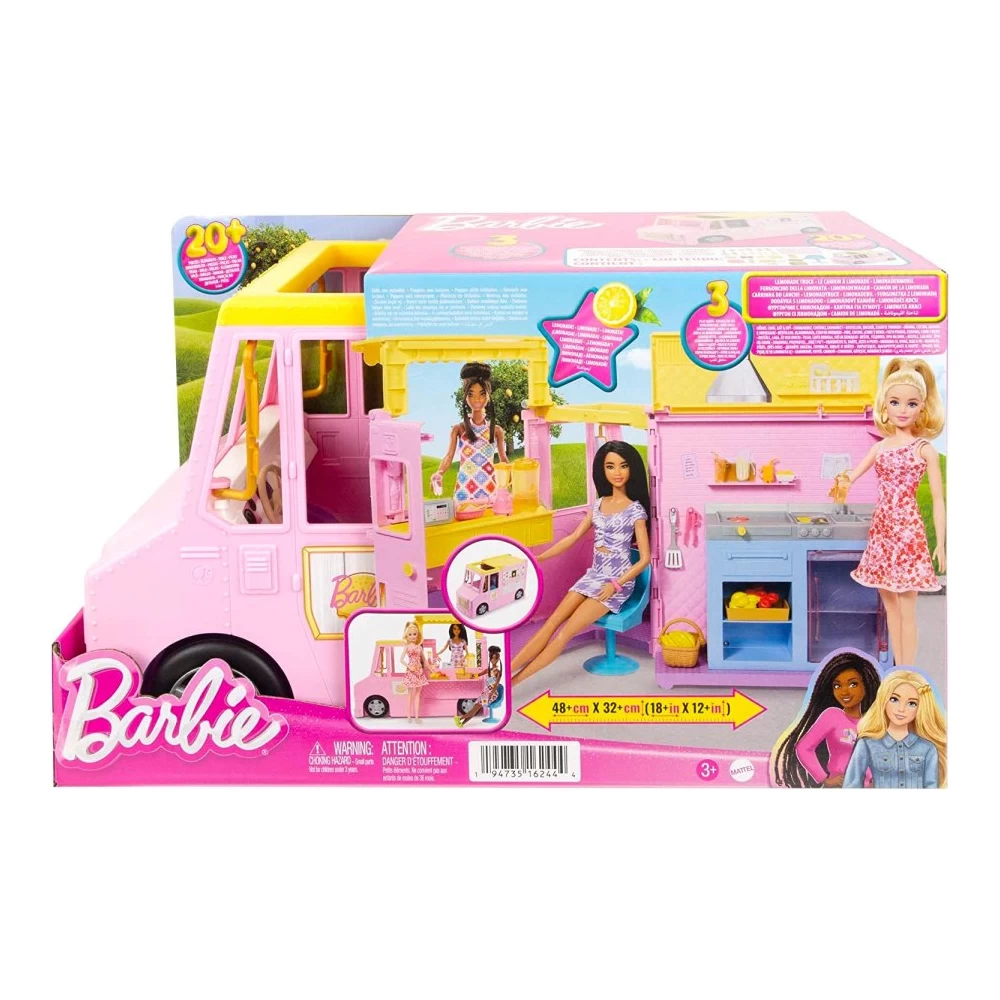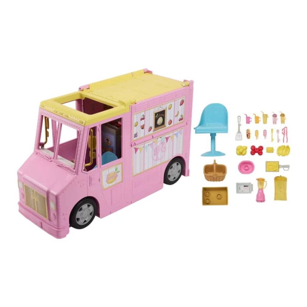 Beep, beep! With super-cute details, this BarbieĀ® lemonade truck has everything you need and more to make iced fruit drinks. It offers a two-in-one play experience: open the truck to use the staging area, or close it up and ride on a hot summer day! The side of the truck transforms into an outdoor dining area with a counter and chair. Itās the perfect playset for a BarbieĀ® doll who wants to start her own food business! Doll not included. Colors and decorations may vary.