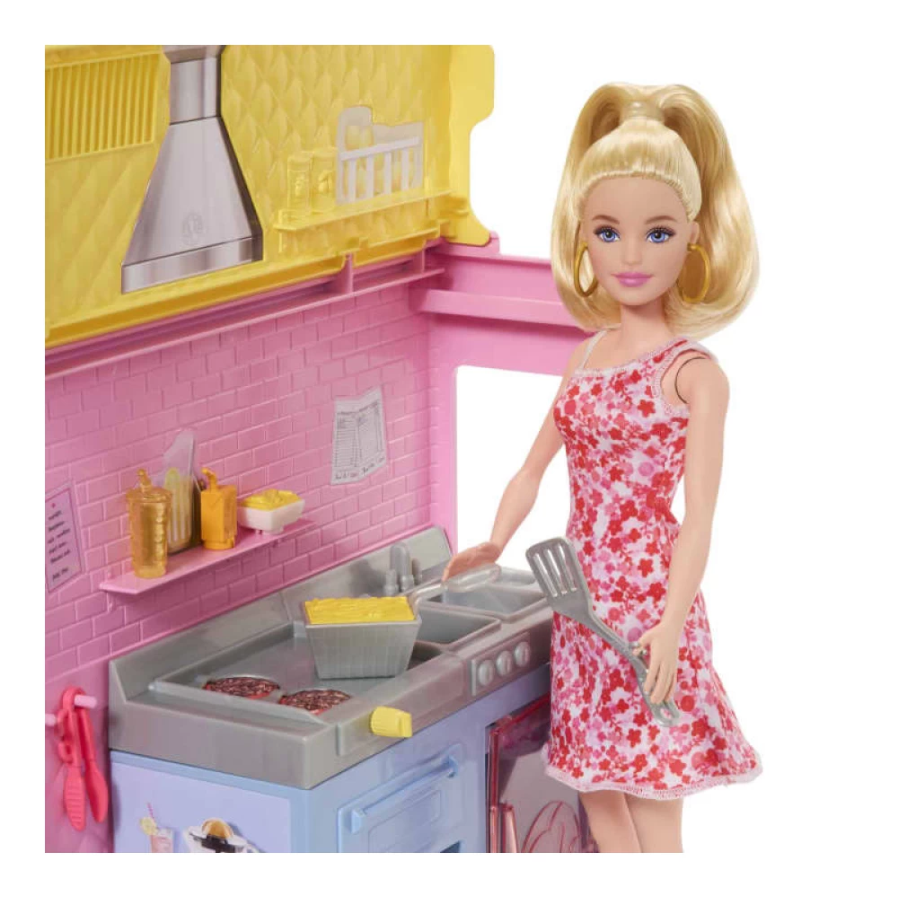 Colorful accessories like an ordering tablet, blender, basket, fruit, juicer, drinking cups, hot dog and spatula add to the playtime fun.