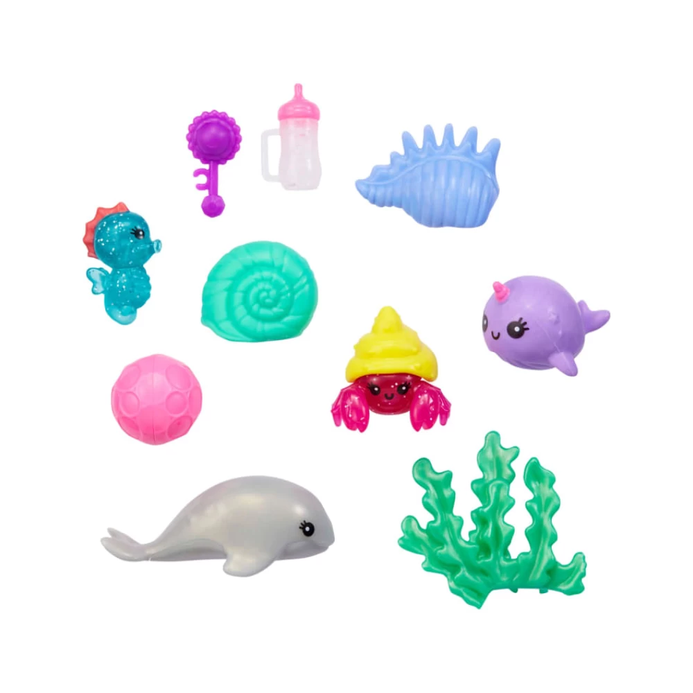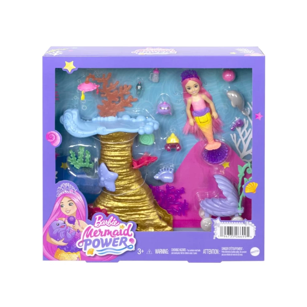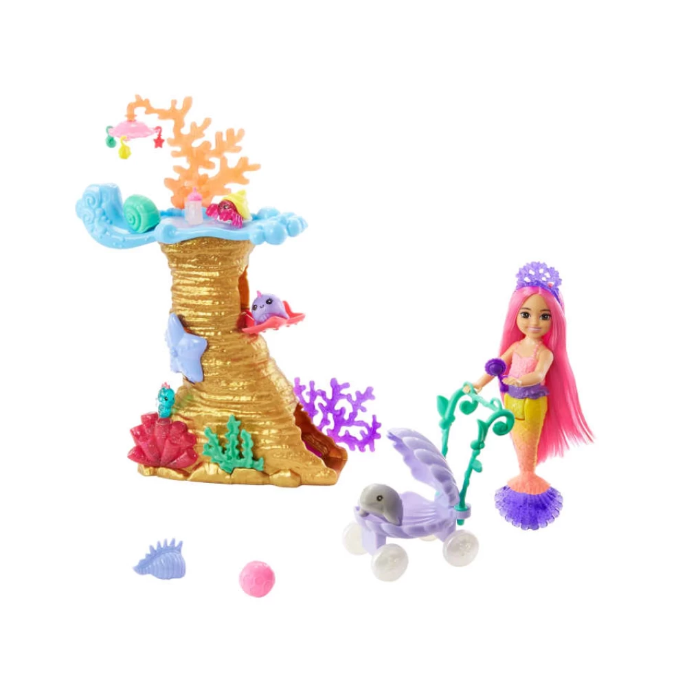 Includes Chelsea™ mermaid doll wearing tiara, 1 coral reef playset, 1 dolphin figure, 1 narwhal figure, 1 seahorse figure, 1 hermit crab figure with 3 shells, 1 stroller, 1 rattle, 1 bottle and 1 ball.