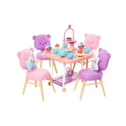 A pastry tray, flower bouquet, lantern, teapot with four cups, four pairs of utensils and six scrumptious desserts are included. Plus, two plush kittens in a teapot and teacup encourage sweet moments!