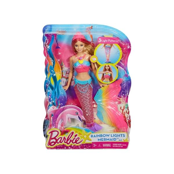- Dip Barbie®Rainbow Lights Mermaid™doll into water to see her mermaid tail glimmer with colorful lights inspired by a sparkling rainbow!