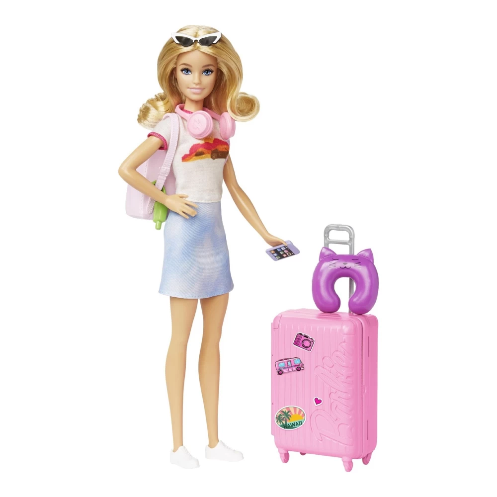 BarbieĀ® āMalibuā Roberts doll is ready to set off to her next destination with her puppy and more than 10 travel accessories. Kids can use the sticker sheet to decorate her luggage ā it opens and closes for realistic play. Pack her suitcase and backpack with travel essentials and recreate favorite moments or dream up new adventures. Ready to help imaginations take off, this BarbieĀ® doll set inspired by It Takes Two⢠makes a great gift for kids ages 3 years old and up. Doll cannot stand alone. Colors and decorations may vary.