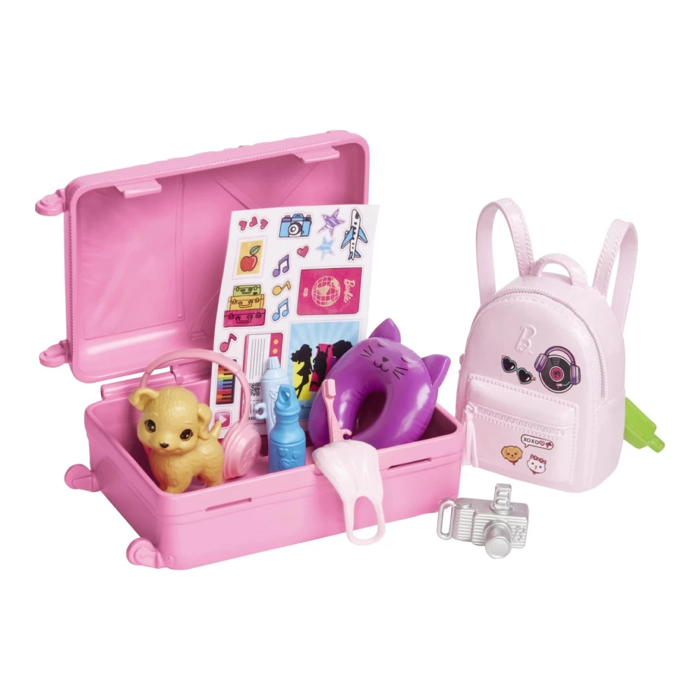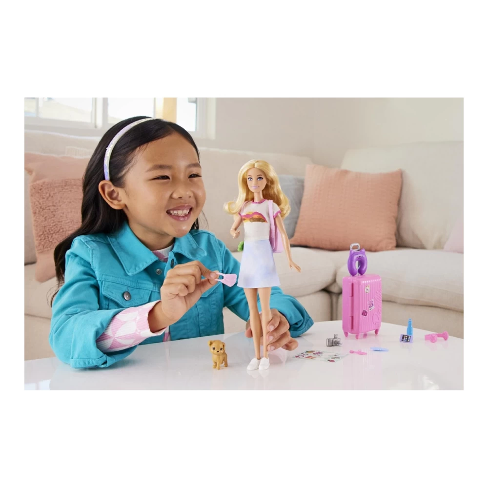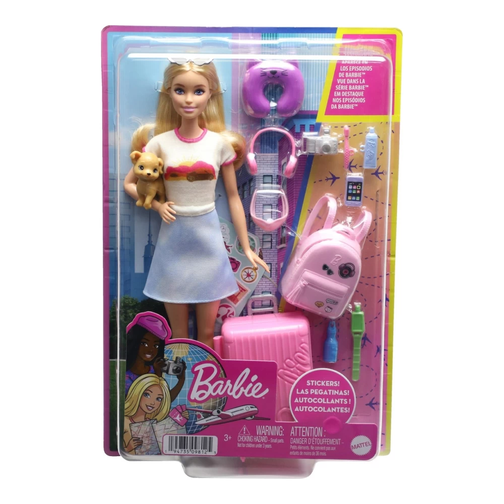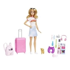 Includes 1 BarbieĀ® doll wearing top, skirt and shoes, plus 1 puppy, 1 suitcase, 1 backpack, 1 pair of sunglasses, 1 camera, 1 phone, 1 water bottle, 1 toothbrush, 1 toothpaste tube, 1 face mask, 1 travel pillow, 1 bottle of hand sanitizer, 1 pair of headphones and 1 sticker sheet.