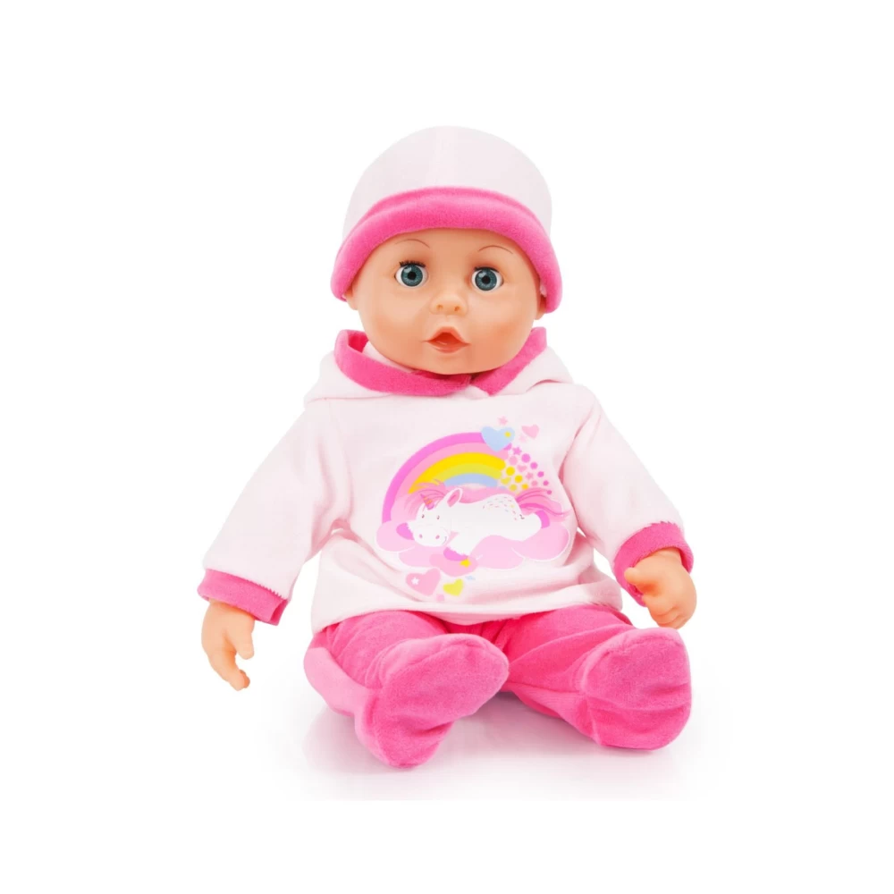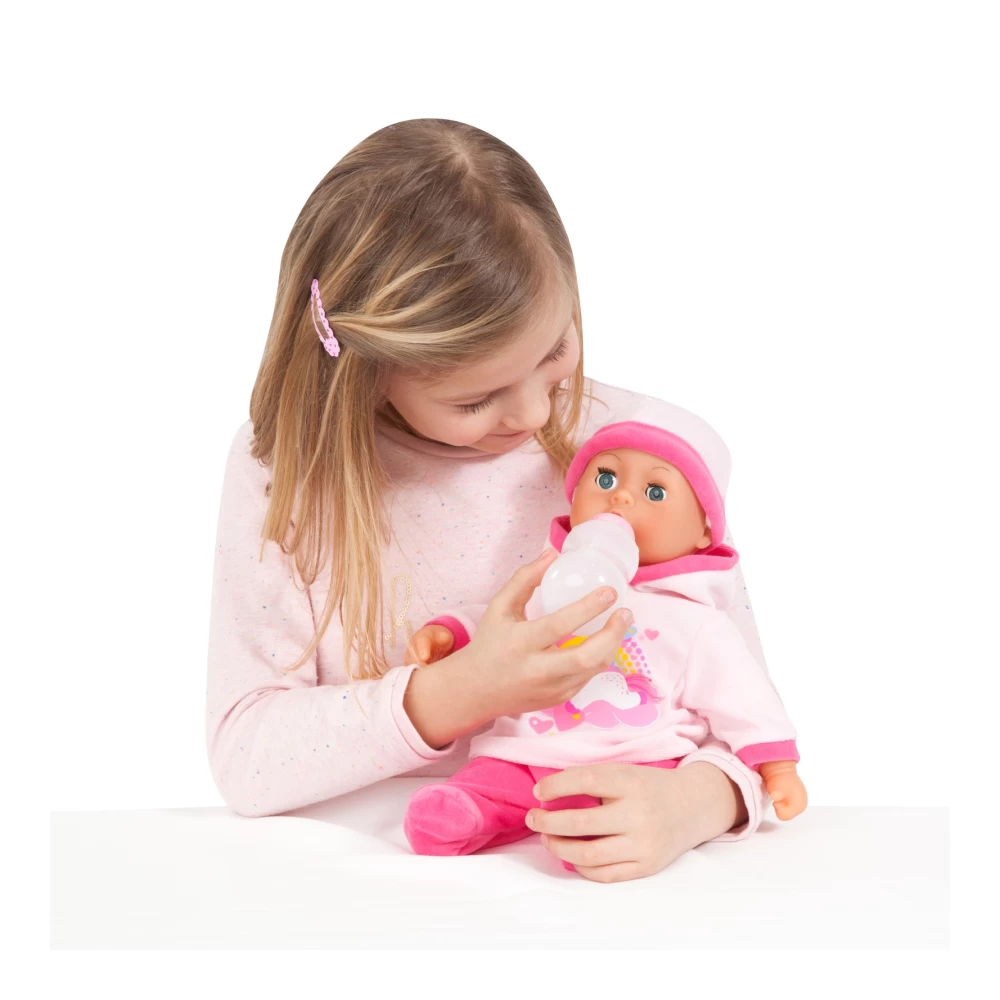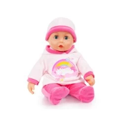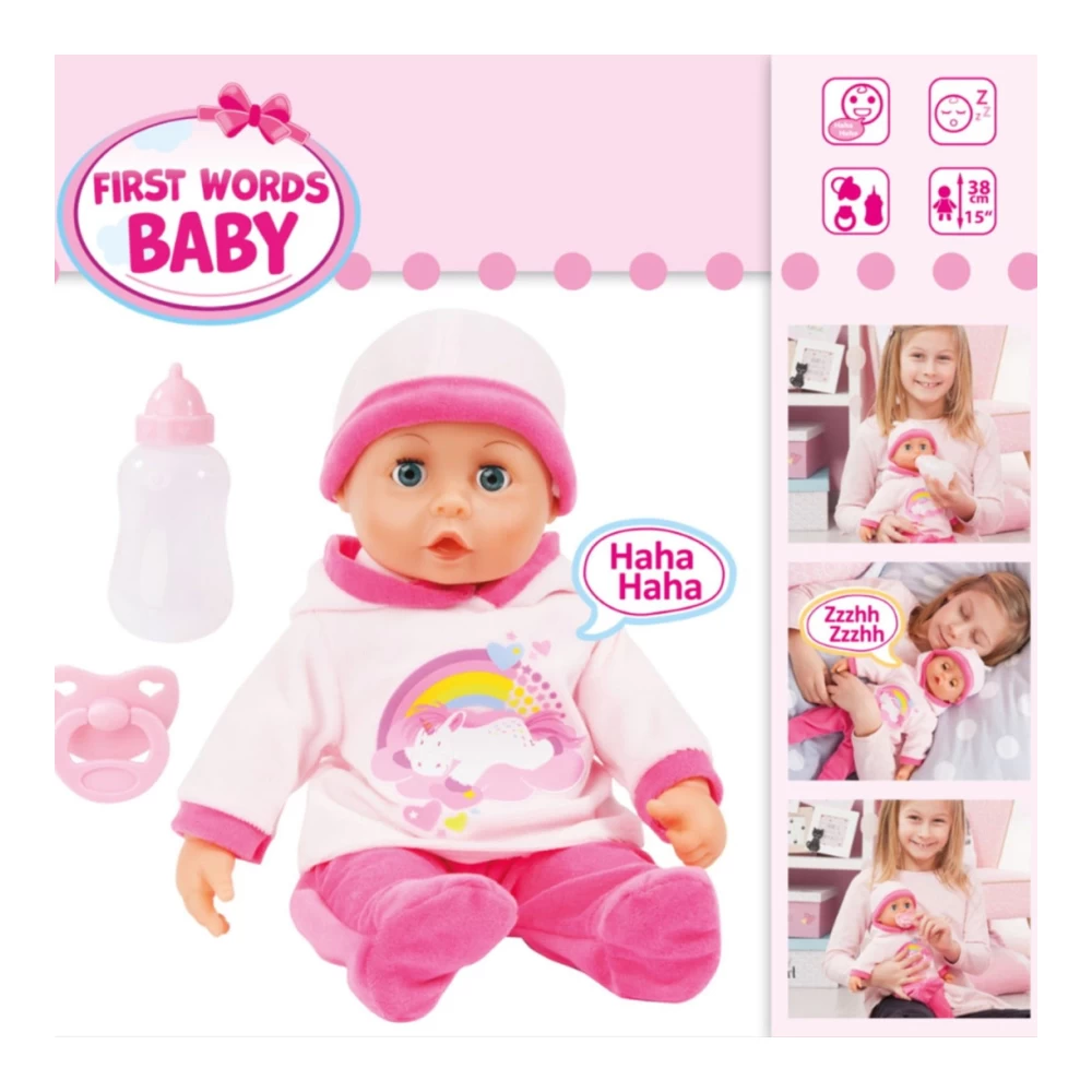 This First Words Baby doll (38cm Tall) has a variety of functions. When you press the doll’s tummy you can hear 24 different baby sounds. The doll wears a modern playsuit with a cute matching cap. Due to its size this First Words Baby doll can be taken everywhere. The doll is boxed in a beautiful showbox which includes a pacifier & Bottle.