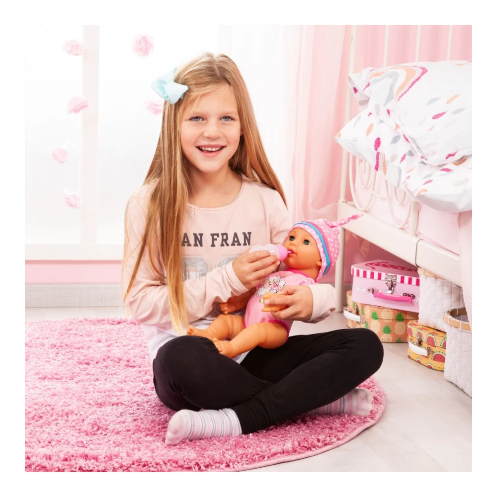 With the included accessories like a plate, fork, spoon, bottle, pacifier, or diaper, you can care about her, feed or comfort her. The doll wears a magnificent body with a colour matching cap.
