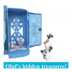 Play areas include a fold-out slide and a sled to ride down it, an ice-inspired staircase that leads to the balcony, and a hidden room for Olaf’s treasures.