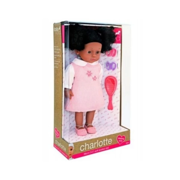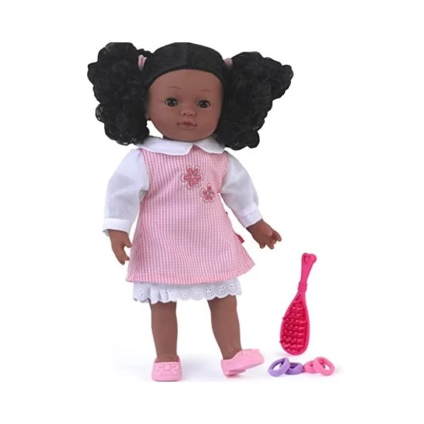 14โณ /ย 36 cmย Soft bodied black girl doll with Afro hair, sleeping eyes, deluxe outfit, shoes, hair brush and hair scrunches.