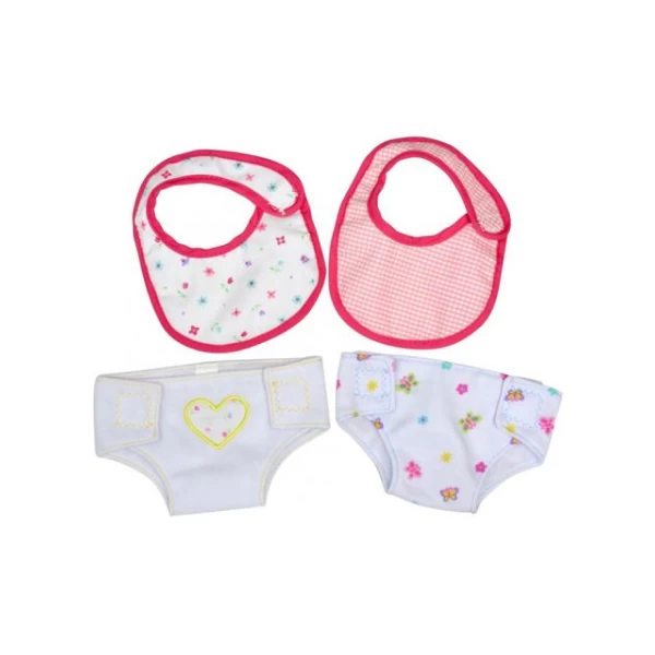 2 fabric bibs & 2 fabric nappies, suitable for dolls up to 46cm (18″).