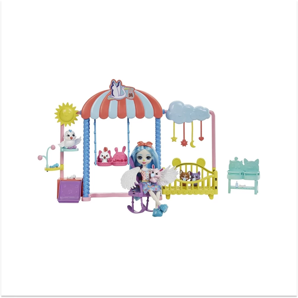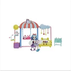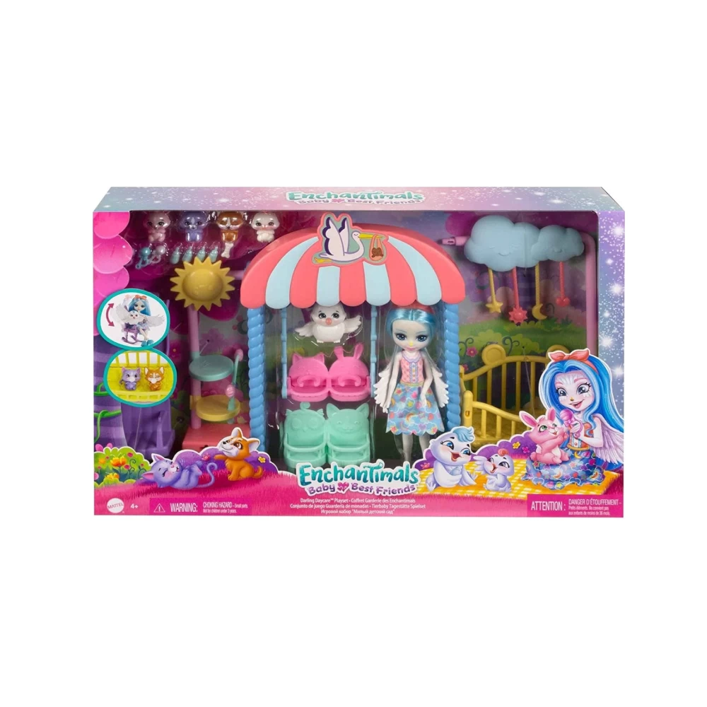 This Enchantimals set is inspired by a group of cute friends who share an unusual bond with their beloved pets. Get ready for all-day fun with the Enchantimals Baby Best Friends Animal Nursery set with Starley Stork doll.