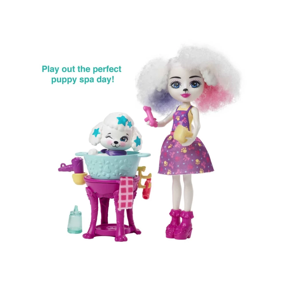 Book a puppy spa day at the Enchantimals™ Poodle Do Beauty Salon™! This 15+ piece playset has everything little ones need to help Perris Poodle™ doll (6-in) bathe, pamper, and style her two puppy besties. For a color-change makeover, just apply cold water on the puppy heads for fun designs! Accessories like a washing station, tub, soap, blow dryer, and comb are perfect for playing out the perfect puppy spa day. Colors and decorations may vary.