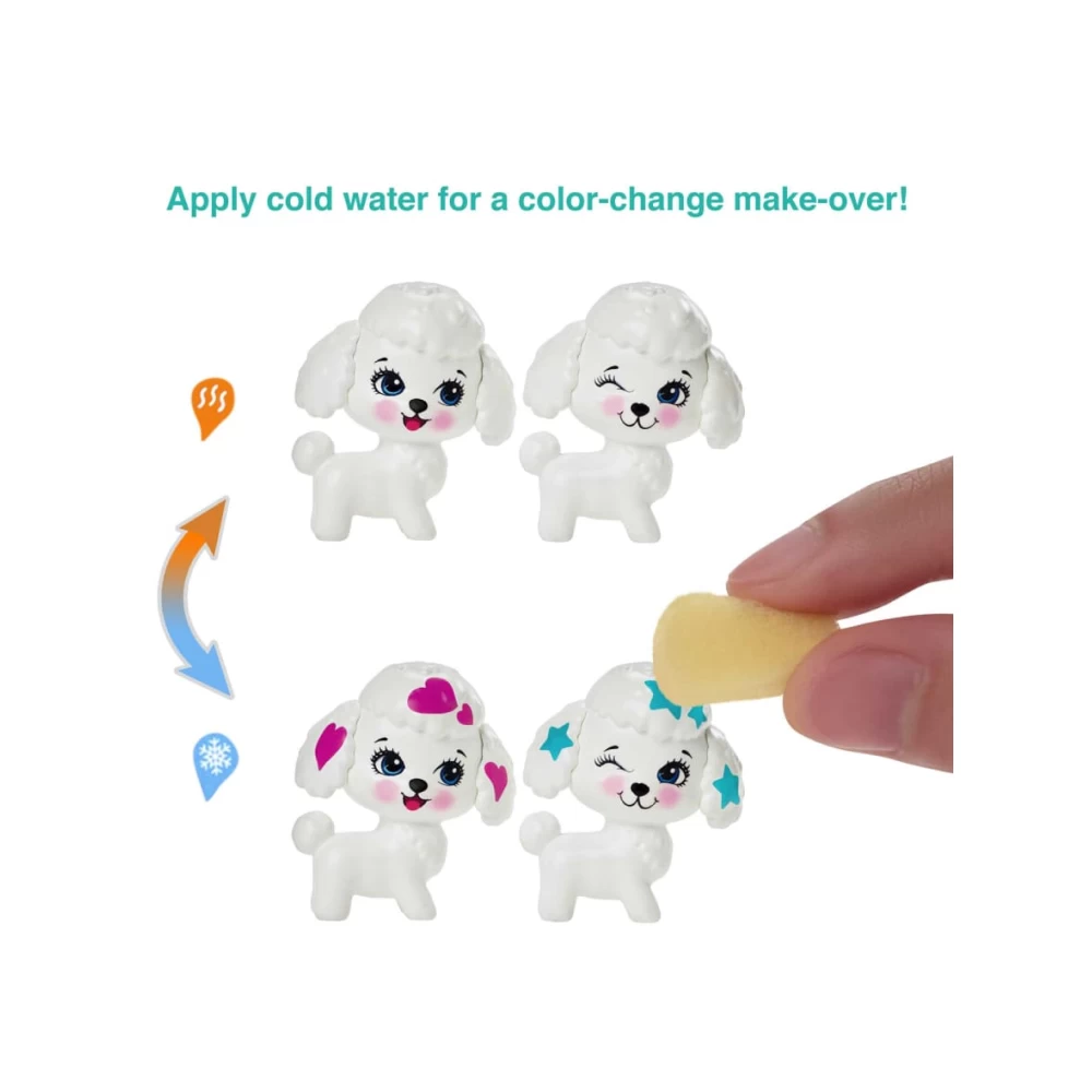 Includes doll (6-in) wearing fashions and accessories, 2 puppy figures, 1 bath stand (6.6-in), and 15+ accessories.