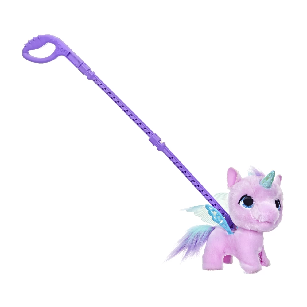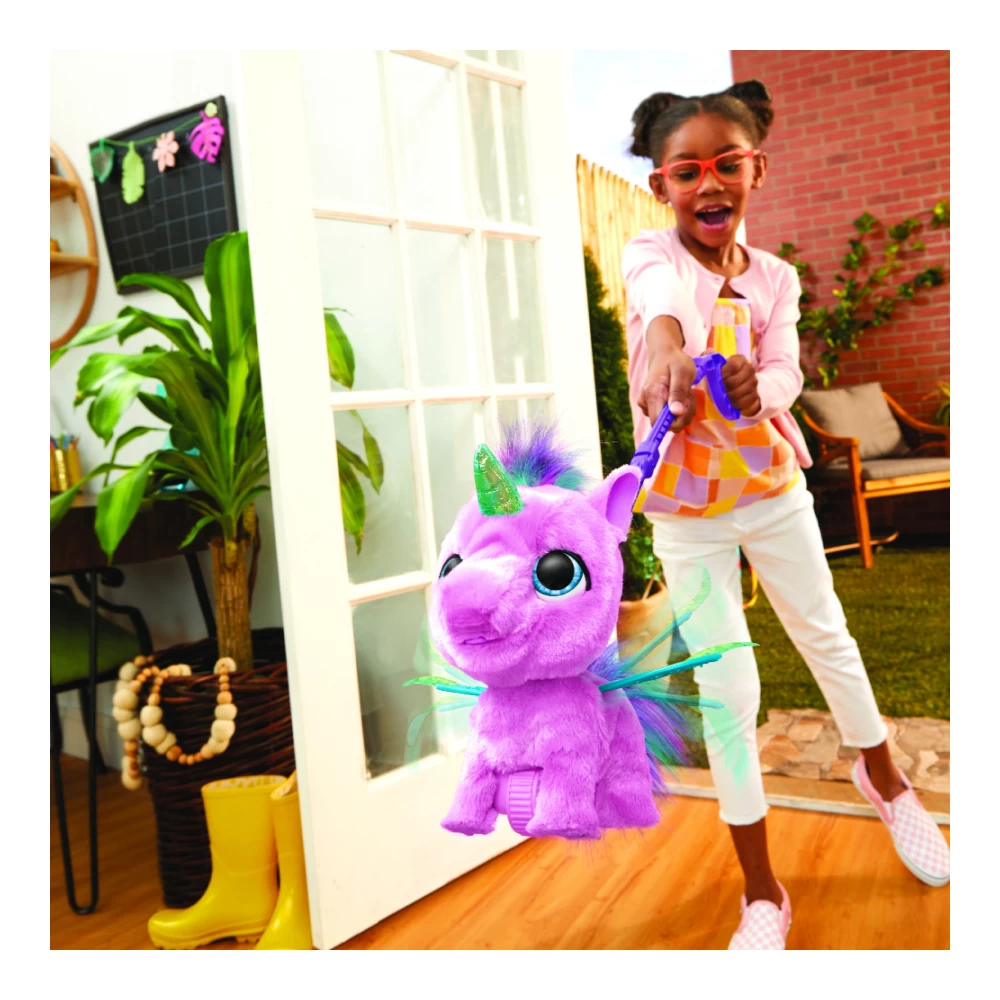[PRODUCT FEATURE 1] PLUSH INTERACTIVE WINGED UNICORN TOY: Take this furReal Flyalots Flitter My Alicorn interactive pet toy for a walk with her easy-assemble, two-part leash
