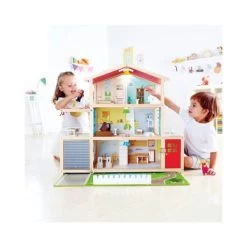 Perfect Family Mansion Dollhouse, The furnished Hape Dollhouse provides inspiration for your child to role-play and imagine various domestic situations. Featuring three different levels with an open face style, the doll house offers a wide variety of ways to play from the front, back, sides, and even top. Hapeās Doll Family Mansion is as realistic as it gets. It includes a master bedroom, a childrenās room, a living room, a bathroom, two balconies (including awning), a dining room, a kitchen, a hallway, a garage and a garden area with swimming pool.The mansion features a family of four dolls and seven doll furniture sets. The doll family can rest well in the bed, clean up in the bathtub or barbecue using the grills.Furniture and Household Appliances. The Mansion Dollhouse moving parts allow children to arrange the household appliances in any way they like. Uniquely shaped rooms offer realistic appeal and moving parts encouraging interaction, and access to the āoutsideā as well. Durable, Water Based Paint, The durable, child-safe paint finish and sturdy wood construction make this a toy that your child will love for years to come.