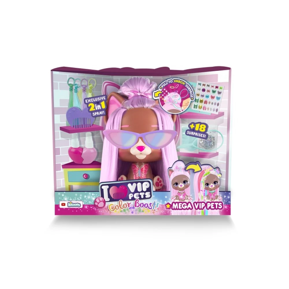 The Mega Vip Pet Nyla Is The Largest Vip Pet Yet. She Has The Longest Hair Measuring 40Cm And It Is Themed With The Colour Boost Series. Discover The New Unboxing Trend By Taking The Ribbon Off Her Bun To Find All The Surprises Hidden In Her Hair.