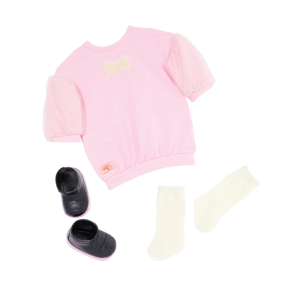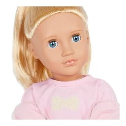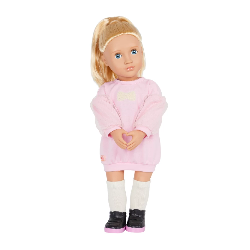 18-inch fashion doll: explore cute, comfy, and stylish fashion with Our Generation doll Reid!Features: bright blue eyes that open and close with long, brushable blonde hair thatโs fun to style! Easy to play: cuddly soft body; neck, arms, and legs rotate to easily change outfits.Includes: 18-inch doll, mesh-sleeve sweater dress with bowtie embroidery, undies, knee-high socks, and high-top shoes with bright pink soles. Mix & match: outfit features easy-open closures to quickly put on and remove; compatible with most 18-inch dolls, outfits, and accessories.Recommended age: suggested for kids ages 3+ (small parts).