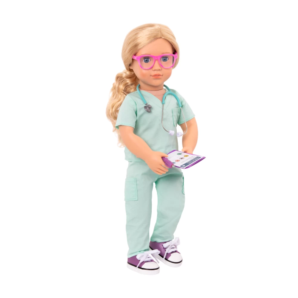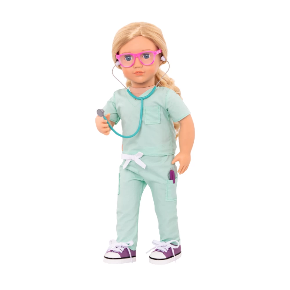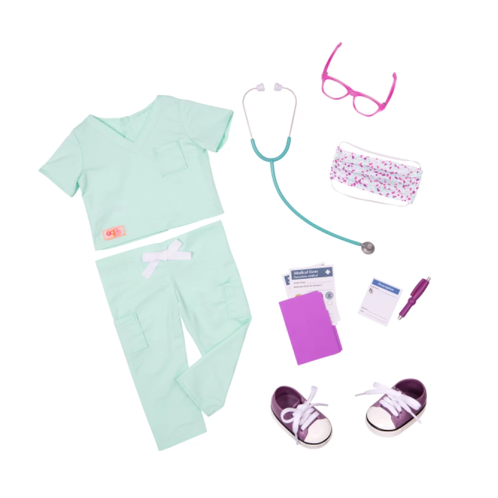 Help your friends get back to happy health with the Our Generation Sweet Surgeon outfit for 18-inch dolls! Doctors know how to save the day, and the right supplies help give your patients the proper care. Put on the face mask and dress your surgeon in the scrubs outfit to prepare for a day at the hospital – it has easy-open closures that make it quick to put on and remove! Check your patient’s heartbeat with the stethoscope and fill out the medical forms just like a real check-up! Keep everything organized in the folder, and use the prescription pad in case they need a little bit of medicine for a speedy recovery. Playing doctor is much more fun when we treat everyone with care!