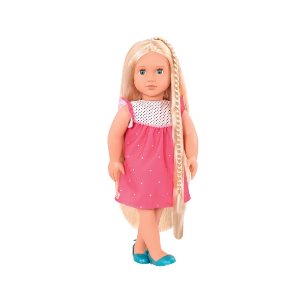 Create fun braids and twists with Hayley! This Our Generation 18-inch Hair Play doll has blue eyes that open and close, and her ultra long blonde hair has extendable braids that can be made longer or shorter with the push of a button! Easily brush Hayley’s hair with the comb, then add bright colors to her styles with the hair extension, decorative ribbon, and heart-shaped hair clip accessories! Hayley can rotate her neck, arms, and legs to easily change outfits, and the easy-open closures on her pretty pink dress make it quick to put on and remove. Use the included styling booklet for extra inspiration, then twin in your favorite styles for endless hair play fun!