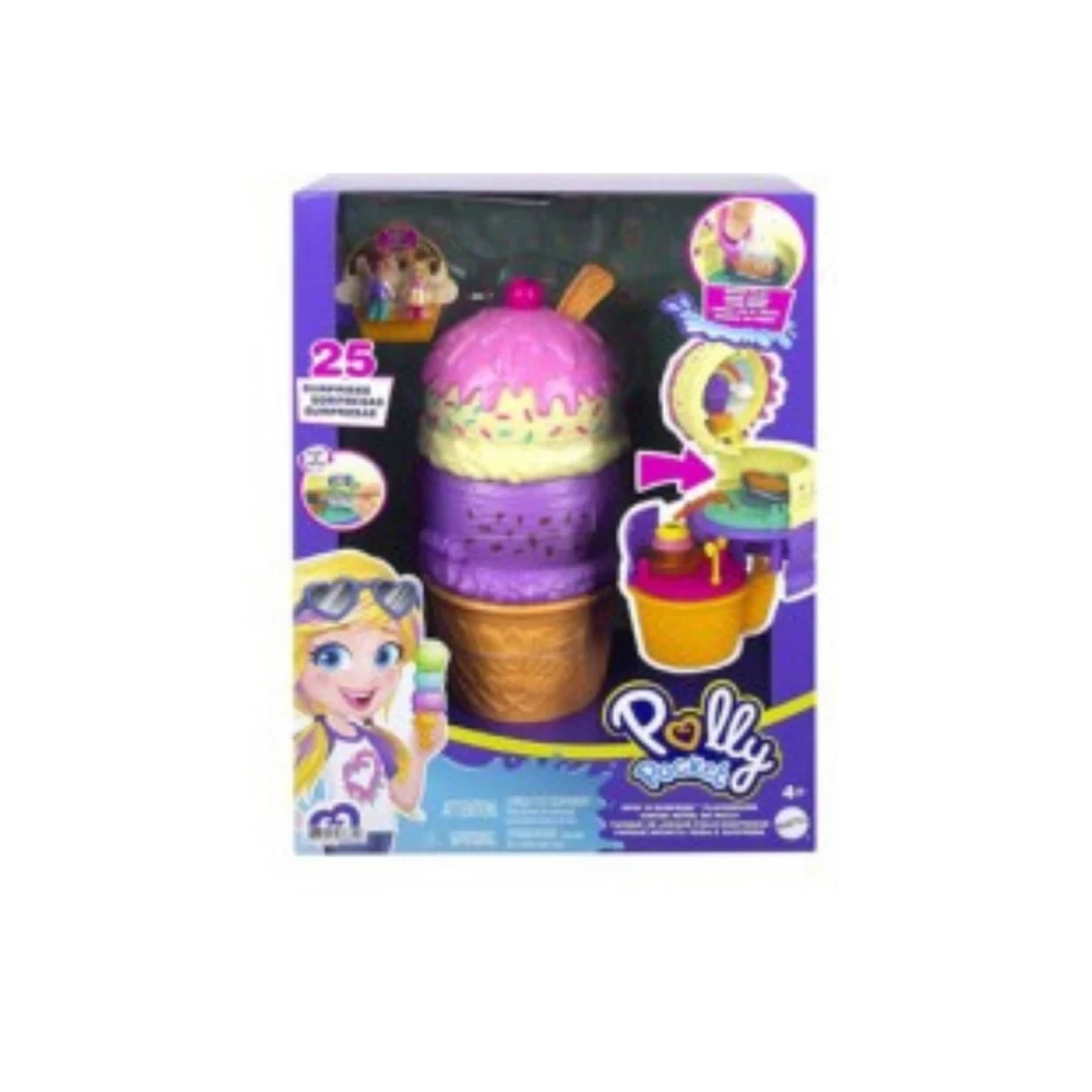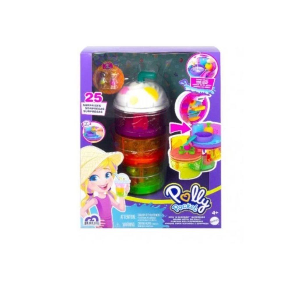 Shaped liked a tropical smoothie drink, the Spin ‘n Surprise Waterpark has a lid that opens and 3 levels that spin out to reveal 3 floors of fun. Also features 25 themed surprises (including micro Polly and Shani dolls, each with 5 movable joints for pose and play action) plus a dolphin, octopus and seahorse.